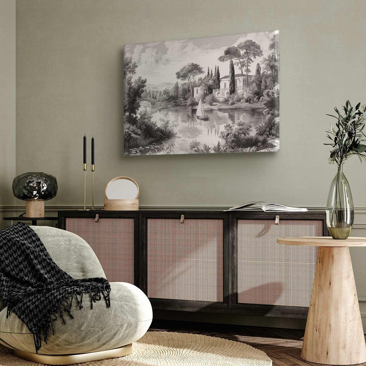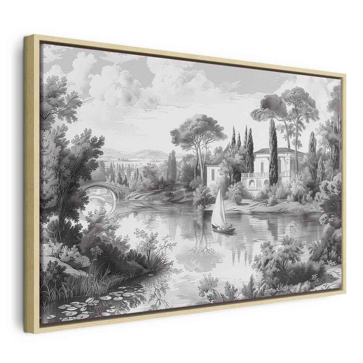 Canvas Print - Black and White Vintage Landscape Retro View of a Pond with a Boat