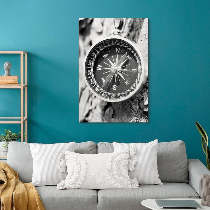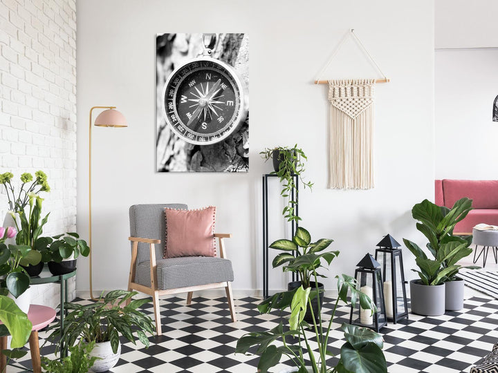 Canvas Print - Direction of the Road (1-part) - Black and White Compass on Tree Background