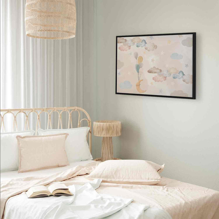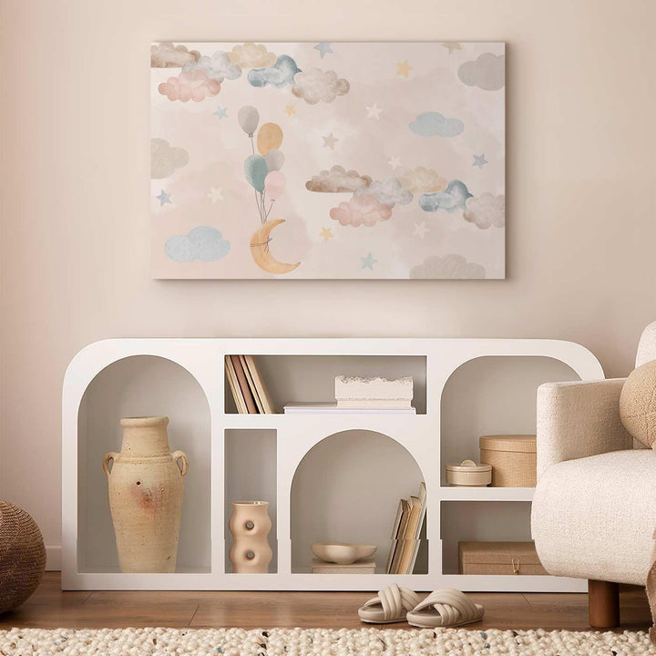 Canvas Print - Fairy-Tale Moon - Pastel Moon with Balloons Among Colorful Clouds and Stars in Subdued Colors on a Light Background