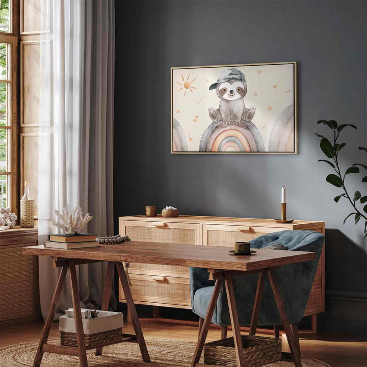 Canvas Print - Happy Sloth - Sloth in Subdued Colors Wearing a Cap Sitting on a Rainbow Among Little Stars