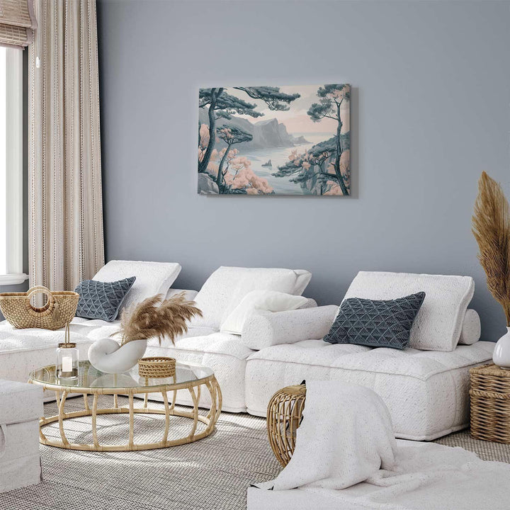 Canvas Print - Mountainous Coast with Trees and Rocks in Light Pastel Blues