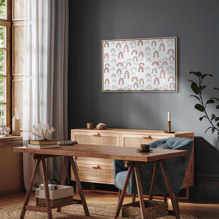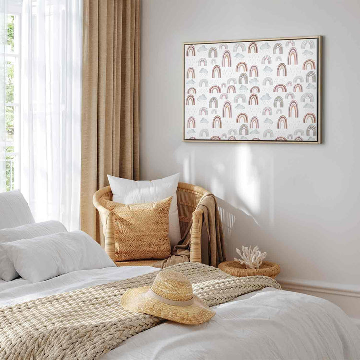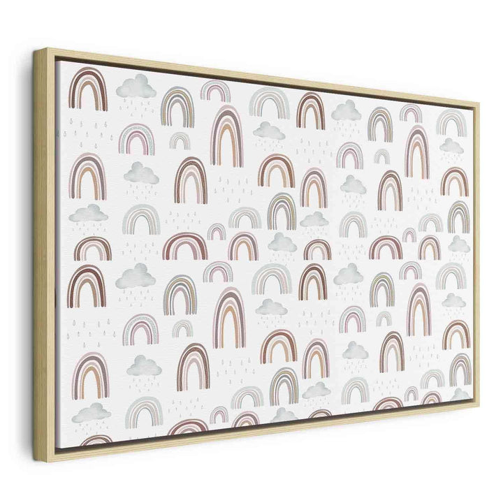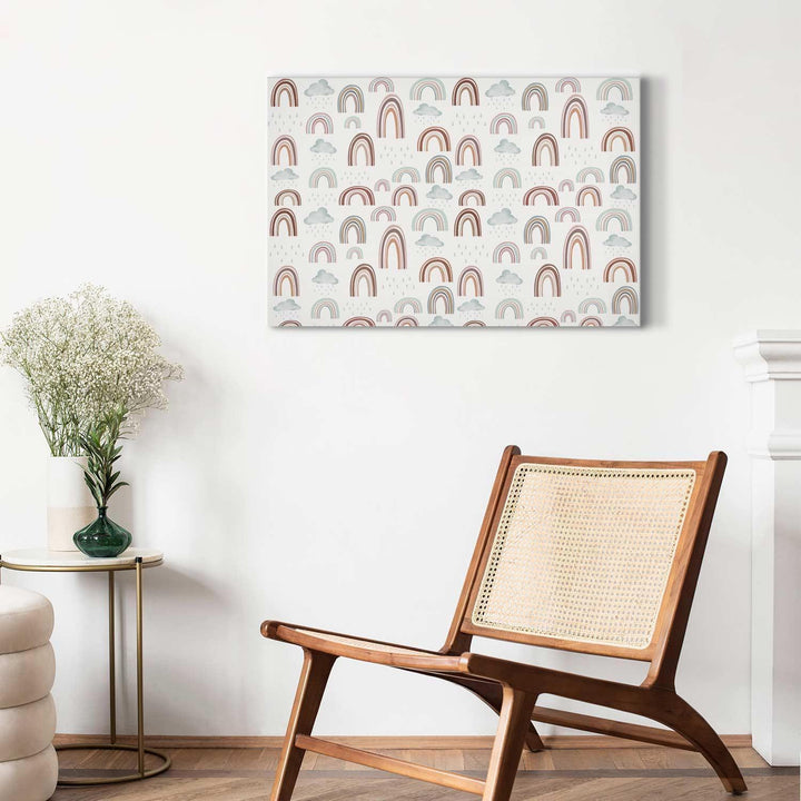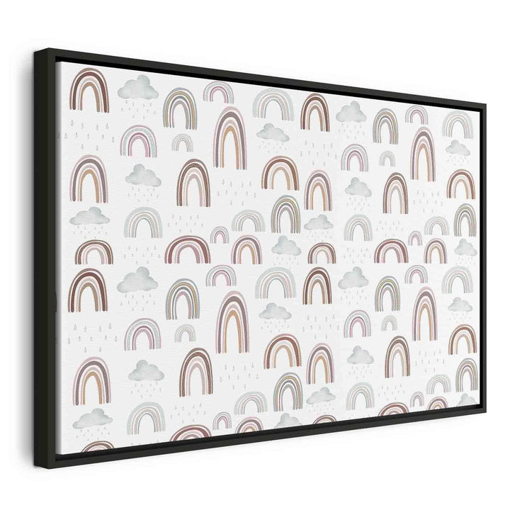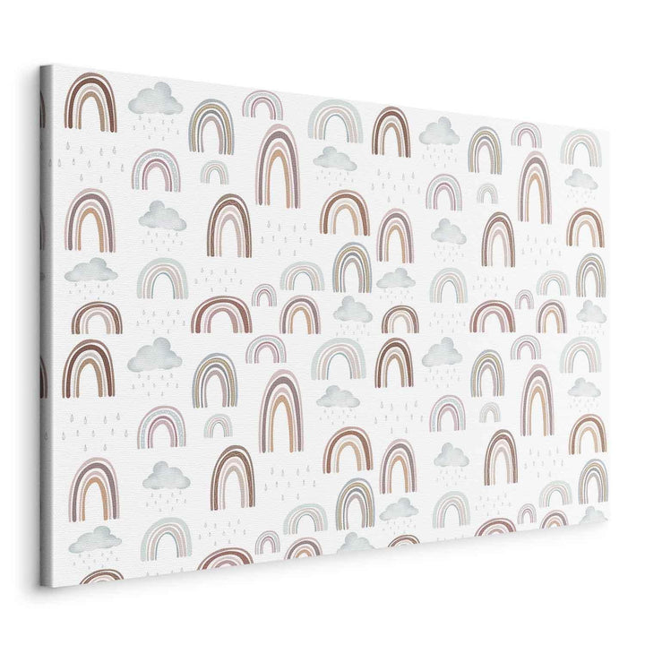 Canvas Print - Rainbows After the Storm - Rainbows of Various Sizes in Pastel Hues Among Rain Clouds in a Gray-Blue Shade