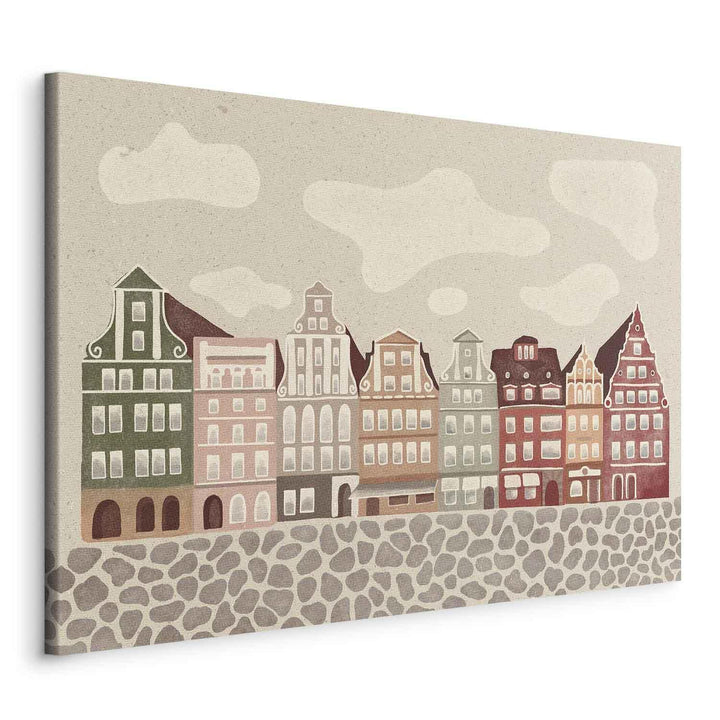 Canvas Print - Salt Square - Colorful Illustrated Townhouses Against a Cloudy Sky Background