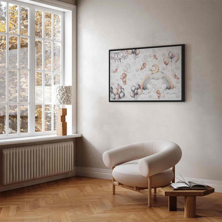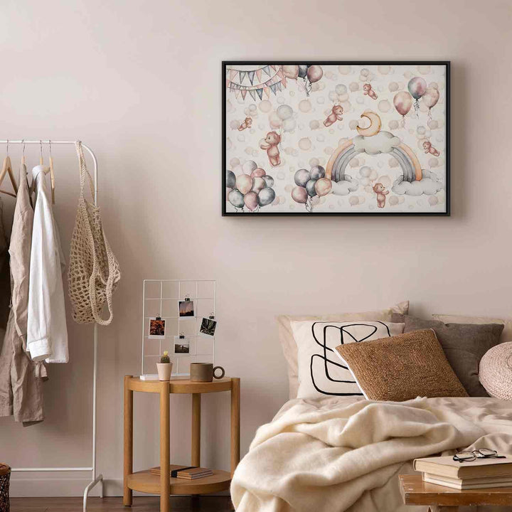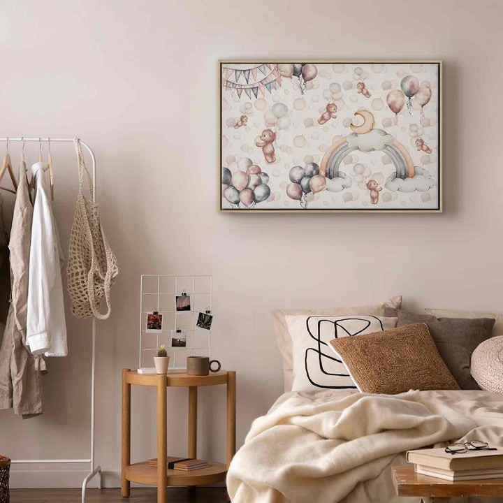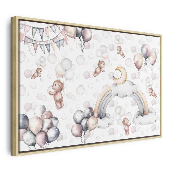 Canvas Print - Toy Bears with Balloons - Flying Plush Bears Among Balloons Clouds and Rainbows in Subtle Pastel Hues