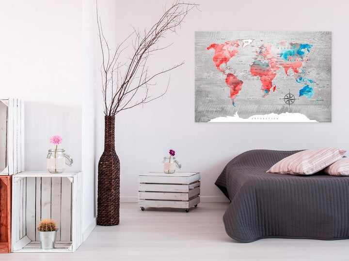 Decorative pinboard "Decorative Pinboard - Red Roam" is a product for people searching for original wall decorations. Thanks to ecological material and interesting design, the ordinary cork board changes into a stylish decoration, which you could use in different ways. You can pin your notes and photos and mark the visited places on the map. Decorative pinboard "Decorative Pinboard - Red Roam" is much lighter from the traditional wall decorations. Thanks to that the decorative cork boards can be hung anywhere in your apartment or office. The canvas print is applied on the cork board. Print is characterized by bold colors and reflects even the finest details. Stick in and pin your notes and create your own individual design on your wall! The cork map is an excellent gift idea for travel lovers!