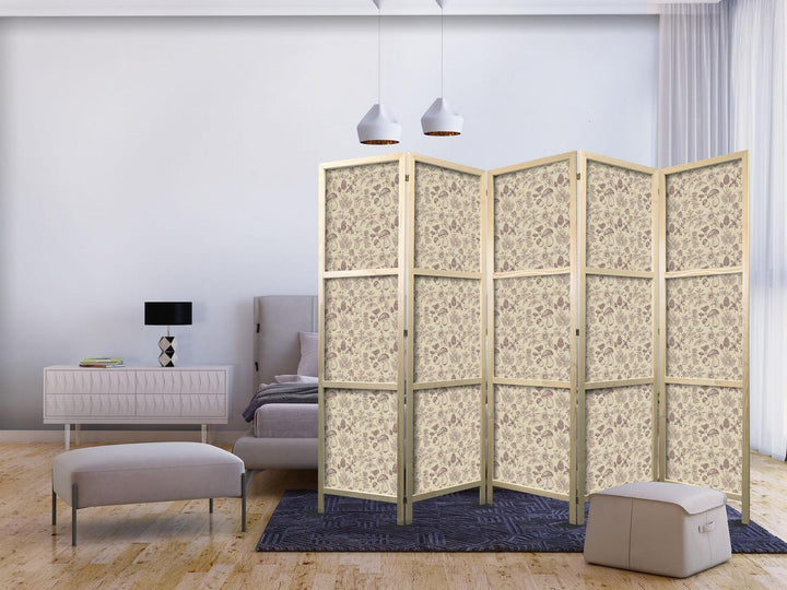 Japanese Room Divider - Beige Nature of the Forest - Mushrooms Flowers and Herbs on a Light Background