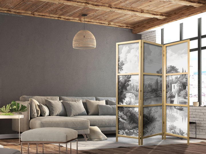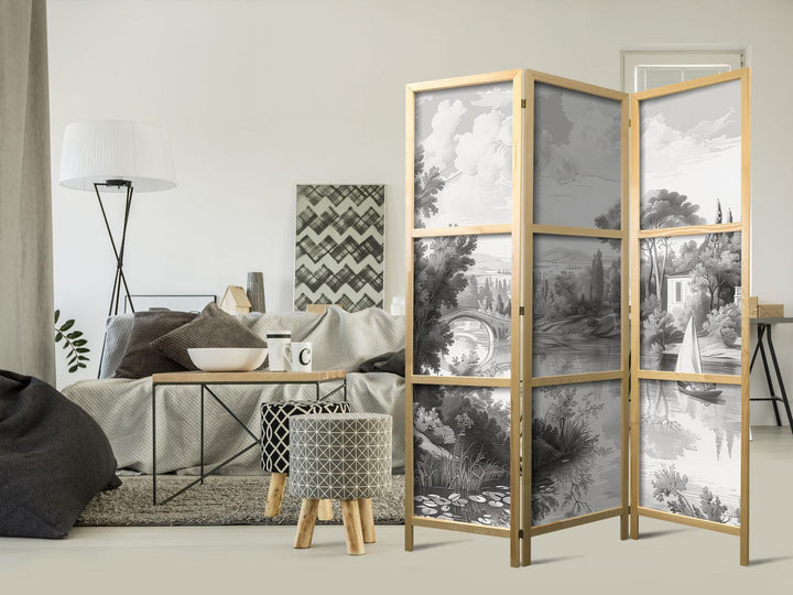 Japanese Room Divider - Black and White Vintage Landscape - Retro View of a Pond with a Boat