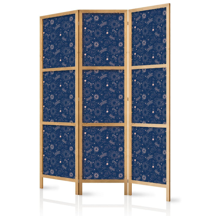Japanese Room Divider - Cosmic Fantasy - Pattern with Suns - Moons - and Dragonflies on a Dark Background