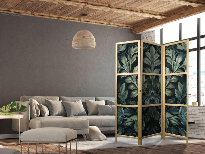 Japanese Room Divider - Dark Green Victorian Leaves - Botanical Carved Composition