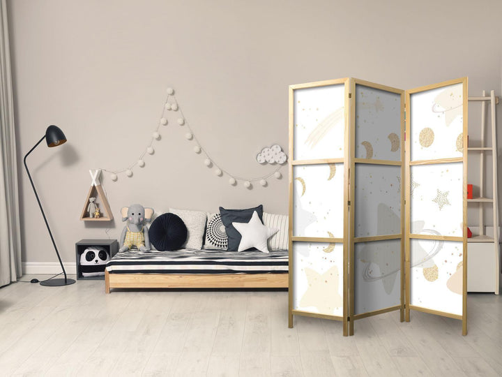 Japanese Room Divider - Fairy-Tale Galaxy - Moon Phases in Shades of Yellow Among Stars in Beige and Ash Colors with Stardust
