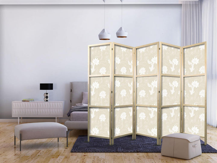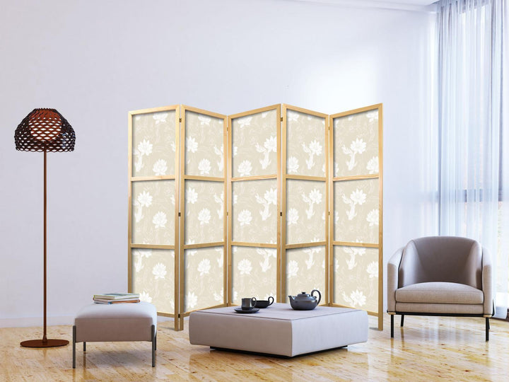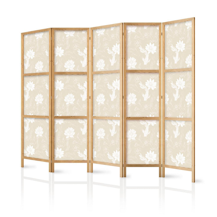Japanese Room Divider - Fish and Water Lilies - Light Oriental Fish Swimming Among Water Flowers on a Delicate Sand-Beige Background