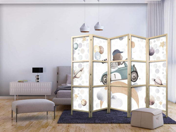 Japanese Room Divider - Galactic Races - Bear participating in car races among planets - clouds - and stars in pastel colors