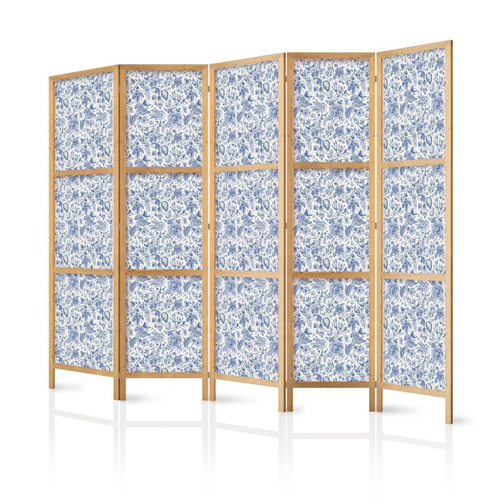 Japanese Room Divider - Illustration in Vintage Style - Blue Flowers on a White Background