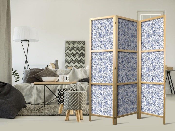 Japanese Room Divider - Illustration in Vintage Style - Blue Flowers on a White Background