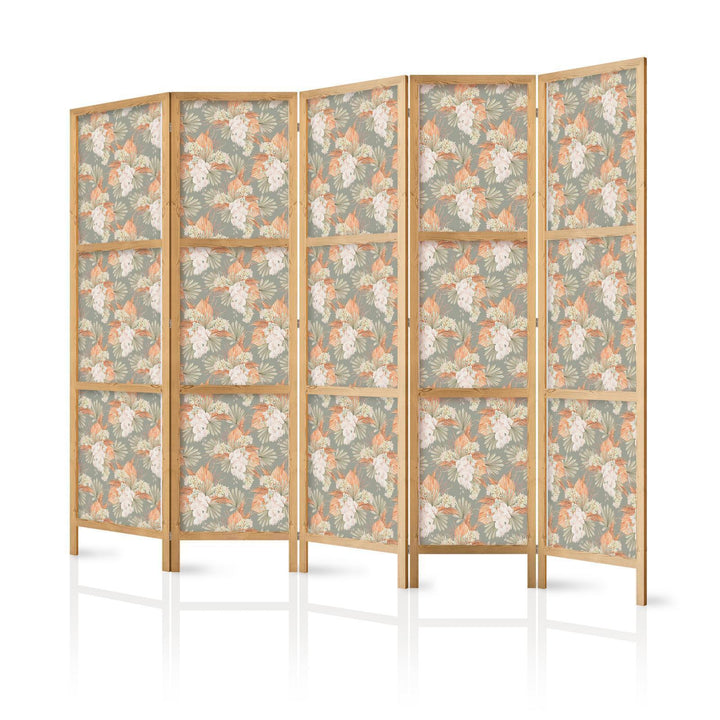 Japanese Room Divider - Little Bouquets - Exotic Flowers and Leaves on a Gray-Green Background