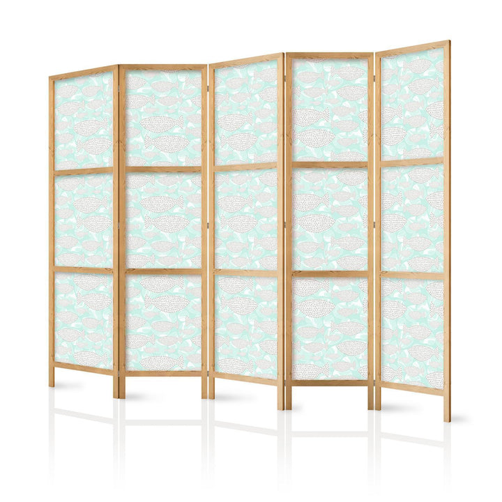 Japanese Room Divider - Minimalist Fish - Fishes From Grey Dots Against a Crystal Sheet of Water in Mint Green Colors