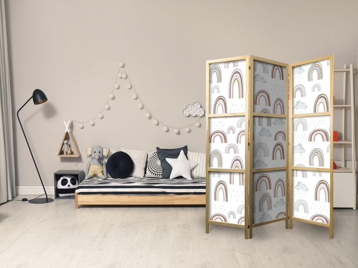 Japanese Room Divider - Rainbows and Clouds - Various-sized rainbows in muted colors among rain clouds in a pale blue shade