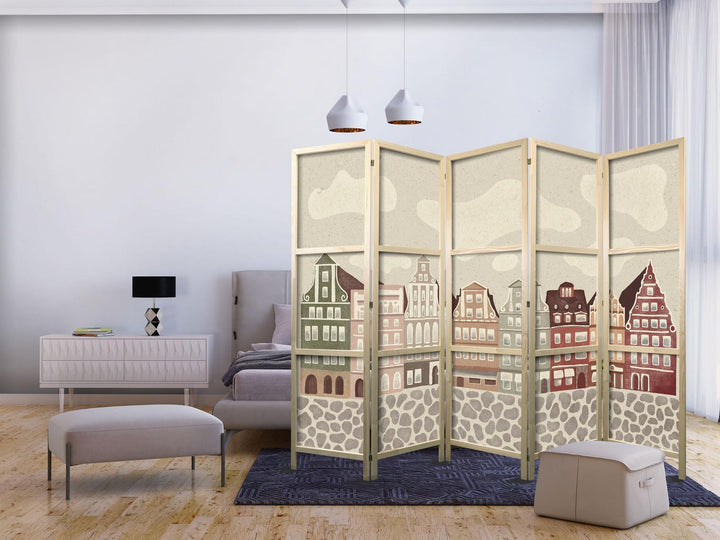 Japanese Room Divider - Solny Square - Colorfully Illustrated Townhouses Against a Sky with Clouds