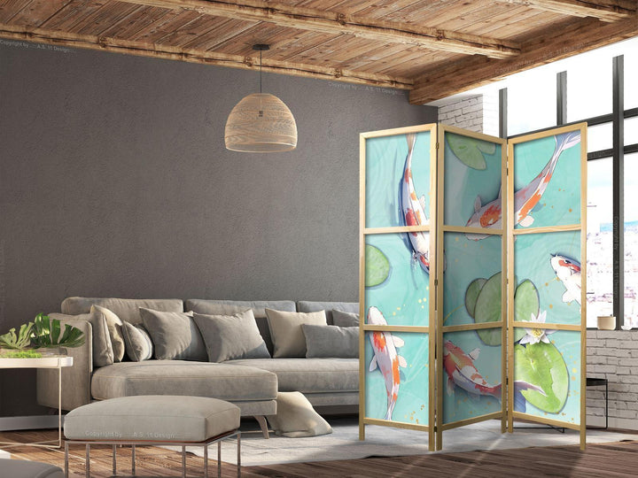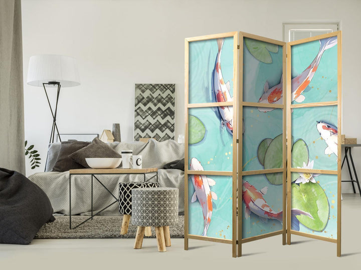 Japanese Room Divider - Spectacular Fish - White-Orange Koi Fish Swimming in Crystal Clear Water with Water Lilies