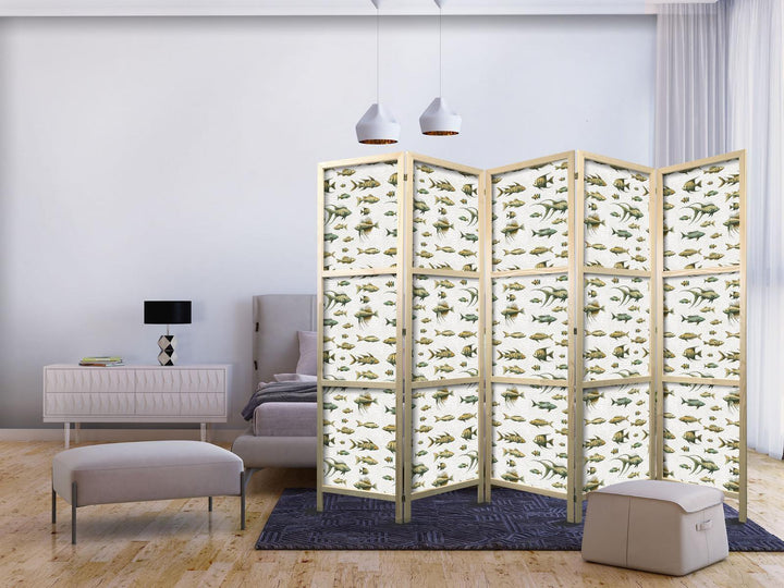 Japanese Room Divider - Unusual Species of Fish - a Cluster of Fish in Muted Colors in Retro Style Against a Background of Beige Streaks