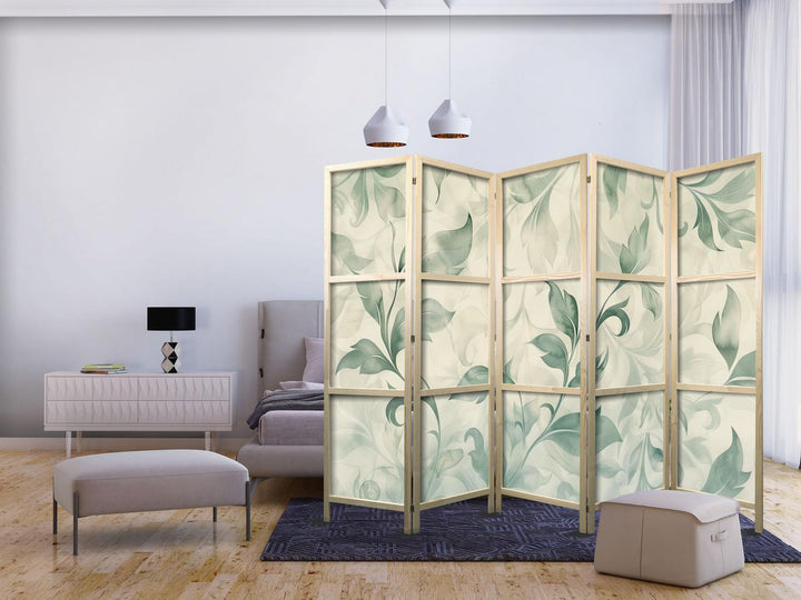Japanese Room Divider - Watercolor Botanical Motif - Delicate Green-Beige Leaves