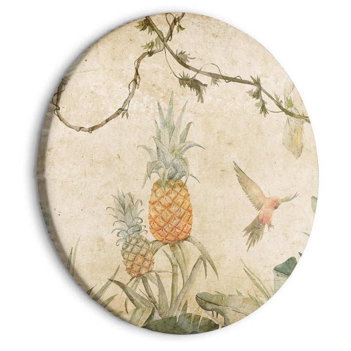 Round Canvas Print - Tropics in muted colors - Parrots and pineapples amidst lush exotic flora in soft shades of green/Parrots in the jungle