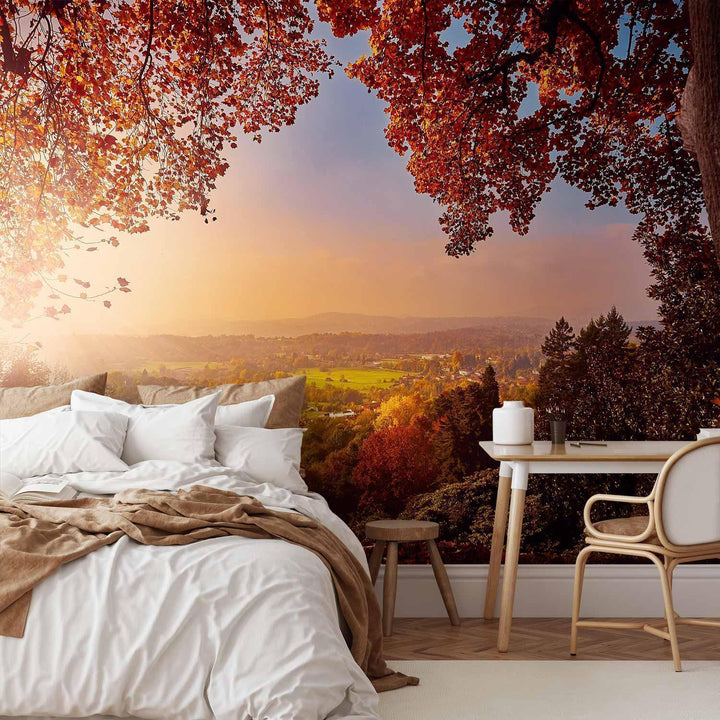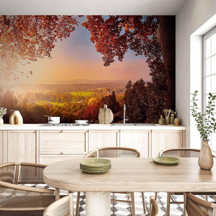 Wall Mural - Autumn delight - sunny landscape with countryside surrounded by trees and fields
