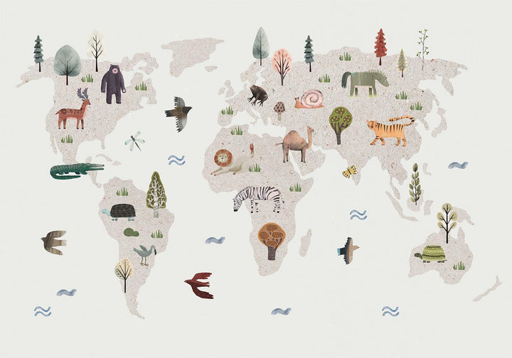 Wall Mural - Beige World - Continents With Animals in Muted Colours