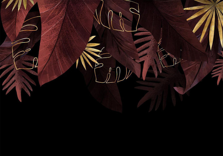 Wall Mural - Jungle and composition - red and gold leaf motif on black background