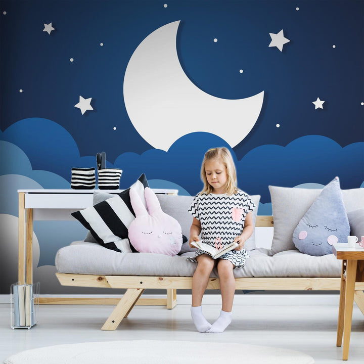 Wall Mural - Moon dream - clouds on a dark blue sky with stars for children