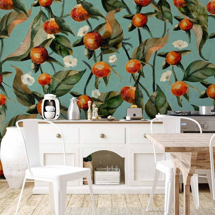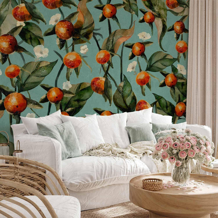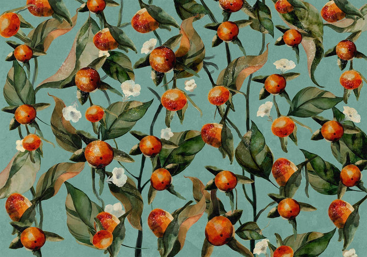 Wall Mural - Orange grove - plant motif with fruit and leaves on a blue background