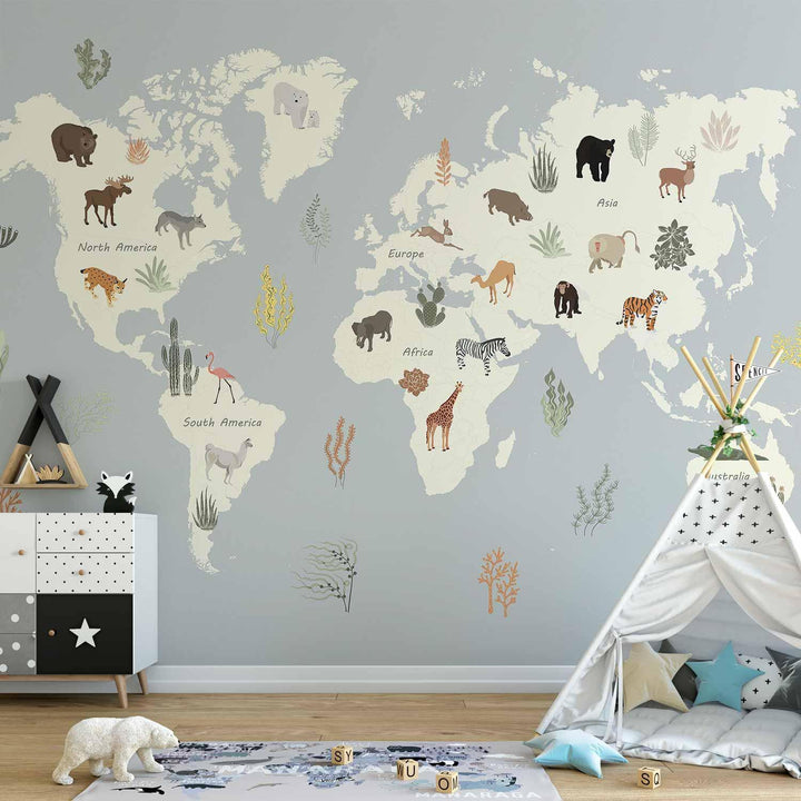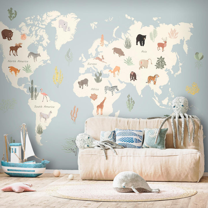 Wall Mural - Pastel Planet - Animals and Underwater Plants on a Map
