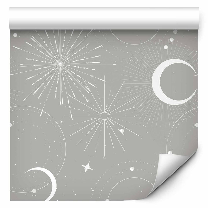 Wallpaper - Cosmic Fireworks - Elegant pattern with moons and stars on a gray background